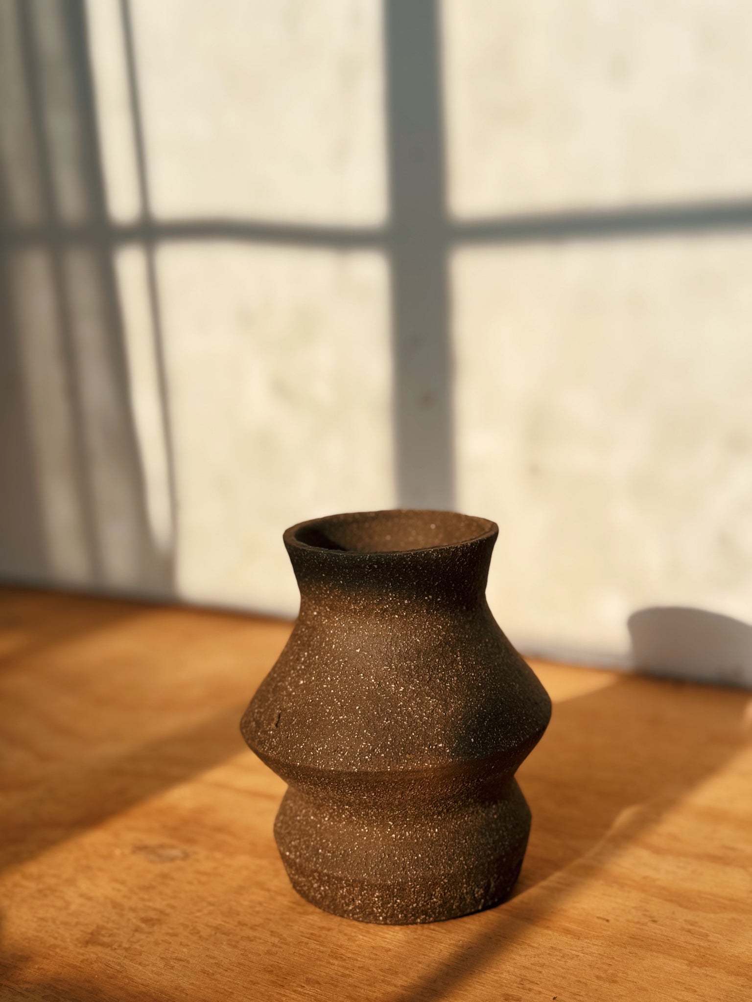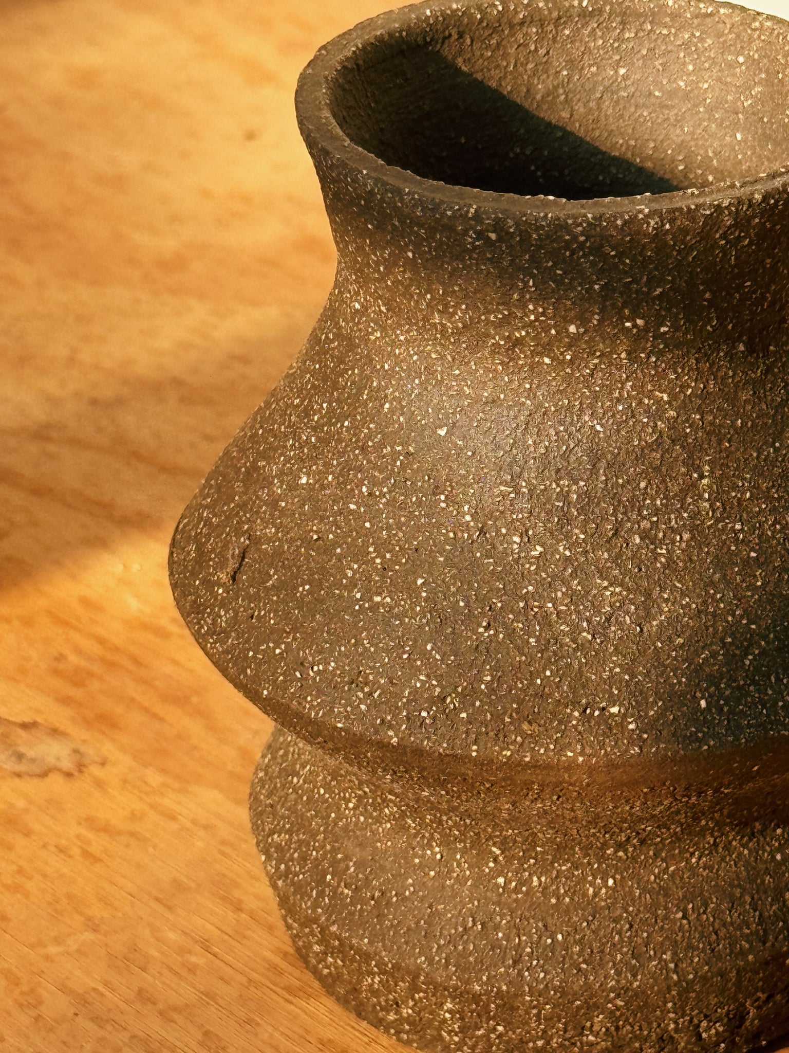 Deep brown speckled clay pot with hole